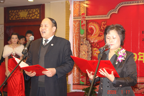 18时,在新年的礼花和祝福声中,集团总裁办公室的成嘉嵘和物资装备中心的万开袖担当的晚会主持人,盛装走向主席台,宣布2009年新春团拜会开始,整个宴会大厅顿时掌声雷动,汇成了一片欢乐的海洋。在掌声和优美的乐曲声中,宋玉庆总裁率领集团高层管理人员步入主席台,向全体员工、亲属以及仍坚守在工作第一线的千名员工致敬祝福。宋玉庆总裁并发表了题为《机遇与挑战同在、光荣与梦想共存》的新年贺词,宋总回顾了2008年度中登集团在困境中稳步发展,在挑战中抓住机遇的工作业绩,也阐述了新的一年中登集团持续发展的战略目标。宋总讲话后,主持人宣布了《2008年度中登集团十件大事》。
