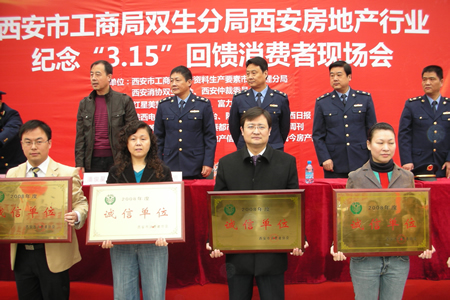 本网讯 2009年3月15日,西安中登房产开发有限公司应西安市工商局的邀请,参加了“纪念3.15回馈消费者现场会”;并在此次活动中,获得西安房地产行业《2008年度诚信单位》称号。