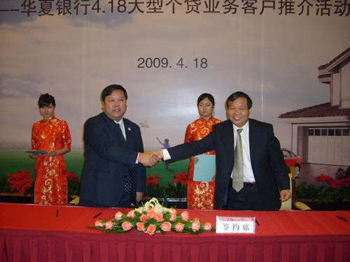 4月18日,华夏银行西安分行在人民大厦举行大型个人贷款客户推介会,多家商会代表及近百位优质客户代表参加了会议。宋玉庆总裁应邀参会并代表江苏商会与华夏银行签署合作协议,公司领导郭华、党娟也陪同参会。