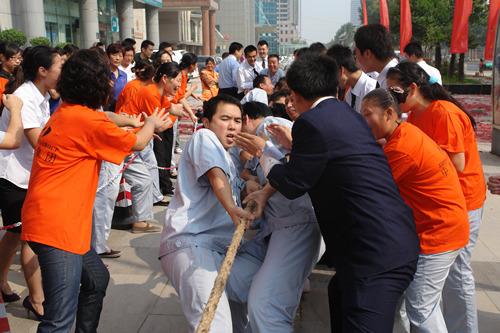 10时,比赛正式开始,赛场上的呐喊声、助威声此起彼伏。参赛的职工为了集体的荣誉而团结一致奋力拼搏,未参赛的职工则在旁边充分展示了拉拉队的无穷力量。队员与啦啦队群情激昂,齐声高喊一、二,一、二,显示出每个成员为了各自的团队而尽心尽力的集体主义精神。