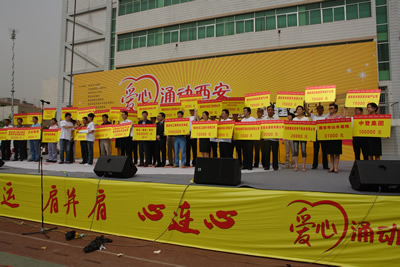 2008年5月30日,由西安市工商联、共青团西安市委、西安市红十字会、西安市慈善会等多家单位主办,西安教育电视台、西安市教育局捐资助学指导中心、西安高级中学承办的以抗震自救、重建校园为主题的爱心募捐活动今天在西安高级中学举行。