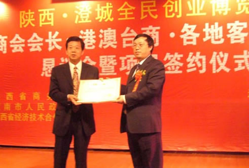 (在期间召开的陕西异地商会恳谈会上特聘陕西省江苏商会为澄城县招商引资代理单位,宋玉副董事长代表商会上台接受铜牌.)